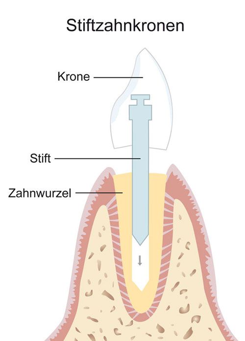 Stiftkronen werden auch als „Stiftzahn“ oder wurzelstiftverankerte Kronen bezeichnet. Vereinfacht kann man sie sich wie eine Krone mit Stiel vorstellen. Der Stiel (oder Stift) dient der Verankerung der Zahnkrone im Wurzelkanal. Er kann aus Metall, Keramik oder Karbon (Kohlenstoff) bestehen.